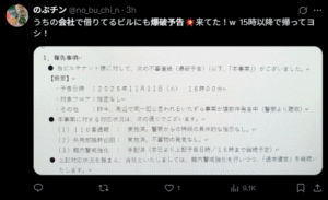 2025年11月11日頃、X(旧Twitter)上で「東京都内の複数のオフィスビルに爆破予告が届いた」という情報が拡散しました。